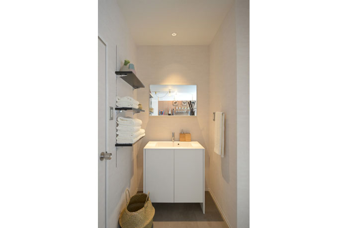 築32年のアパート。和室3部屋+ダイニングの3DKを、壁や柱を取り除き大きな1部屋に。ペグボード(有孔ベニア)や置き家具、ブラインド・カーテン等で好みに合わせて自由にレイアウトをしていただけるようにしました。洗面化粧台、キッチンユニットも家具の様なスタイリッシュなデザインです。