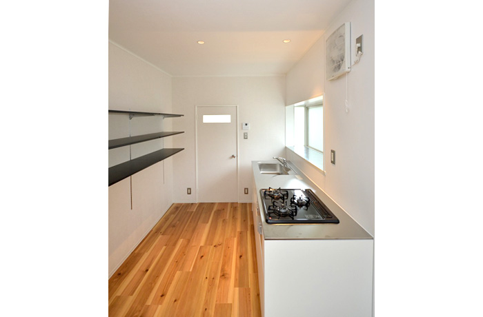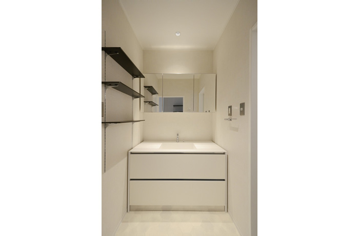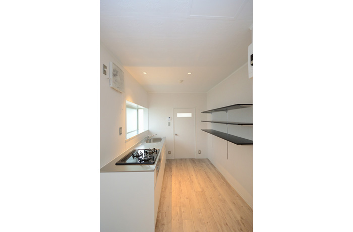 築33年のメゾネットを快適に暮らせる様リノベーション。2階は吹抜を閉じて新たなスペースに。1階は廊下間仕切を全て撤去して広々としたLDに。キッチン・玄関・洗面所は、自由に高さが変えられる棚板を仕込み、住まい手が置き家具を自由に選定して組み合わせながら、フレキシブルな収納レイアウトを可能に。