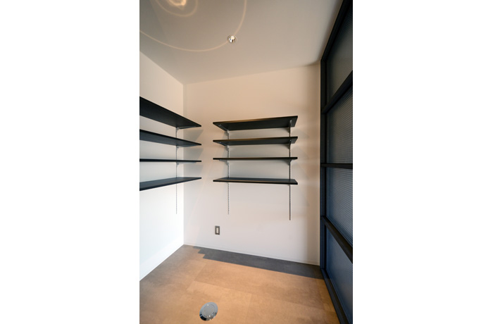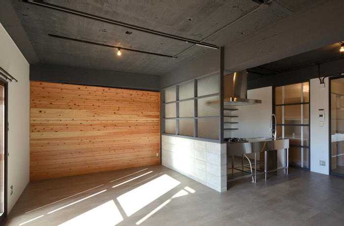 築44年の分譲マンション。給排水、壁天井も再構築。ダクト配管や躯体、コンクリートの天井をそのまま生かした内装に。